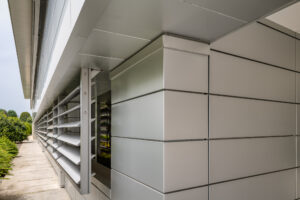 I pannelli in Al con finitura anodizzata, utilizzati per il rivestimento, sono stati posizionati uno dall’altro a circa 10/12 mm per correggere eventuali imperfezioni e favorire dilatazioni del materiale. La tipologia di posa è stata del tipo “staffa con piastra di sostegno”: un sistema di aggancio con la struttura dell’edificio, fino al pannello prefabbricato del capannone, tramite tasselli di espansione in acciaio.